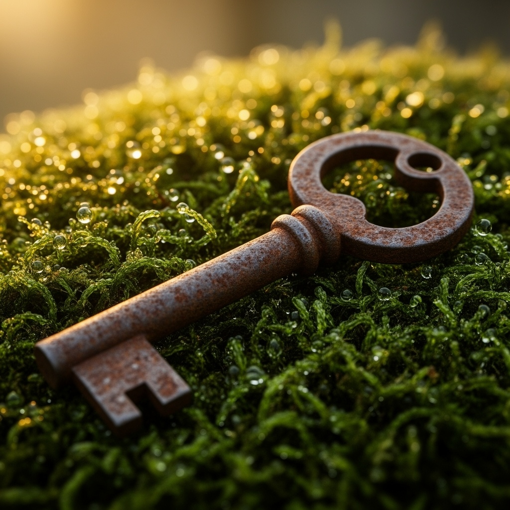 A hyper-realistic macro close-up of a rusted vintage skeleton key resting on a bed of damp, vibrant green moss. Microscopic water droplets should be clinging to the moss filaments, reflecting a soft golden hour sunlight. Deep depth of field with sharp focus on the pitted metal texture of the key.